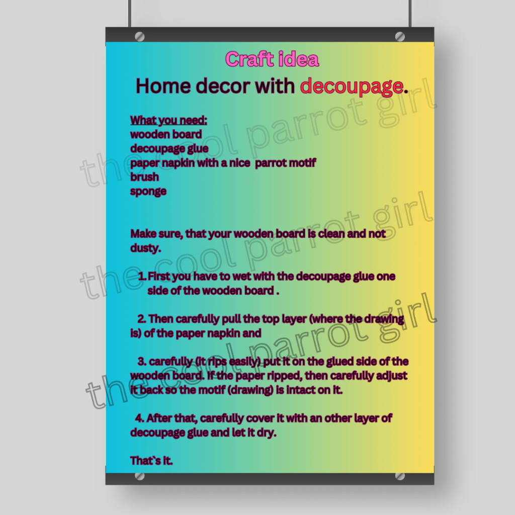 What to do when you really like parrots and colours and you would like to show people that life around us is beautiful and full of miracle? As the cool parrot girl, I do crafts. Every kind of arts. Drawings, wooden painted jewellery, 3d printed items, 3d printed parrots, 3d printed miniatures, also AI generated parrots that capture your attention. That`s what inspired naming my brand for the cool parrot girl in the first place.