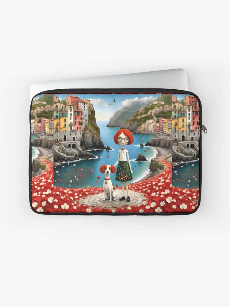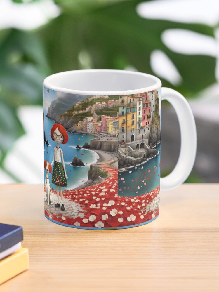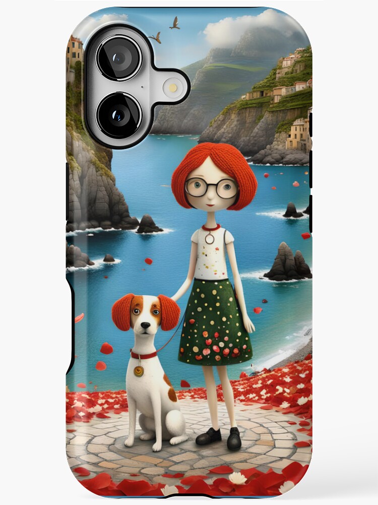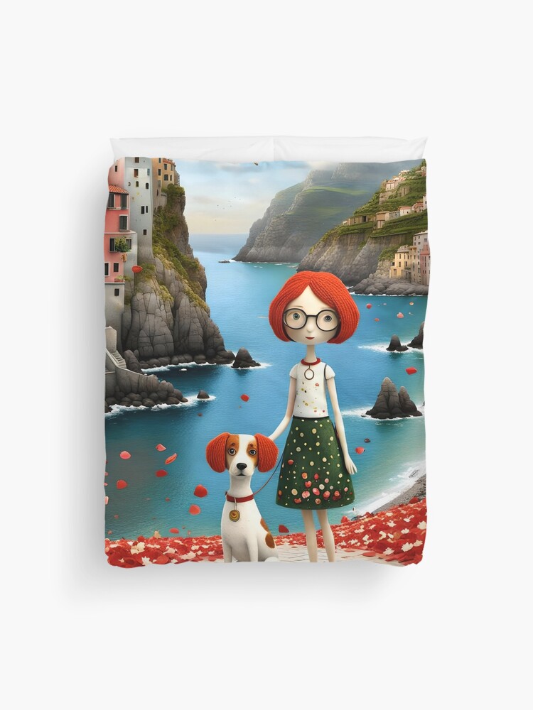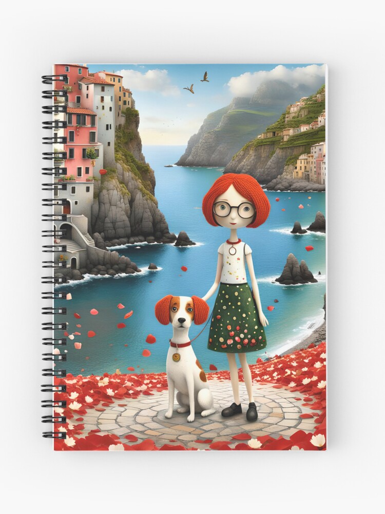 A sweet doll and her playful cocker spaniel enjoy a sunny day in the colourful harbour of Cinque Terre, Italy. Illustrated in a cute cartoon style with vivid, cheerful colours